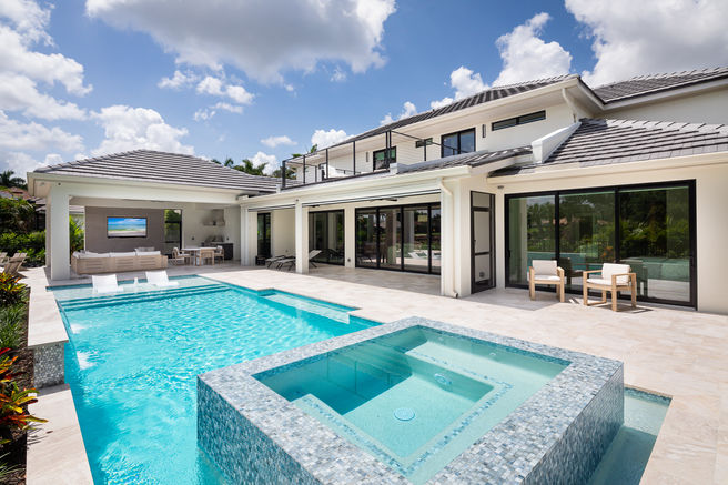 Experience the allure of twilight with these captivating images of modern luxury homes, featuring illuminated pools, palm trees, and outdoor seating areas, creating a serene and elegant ambiance as the day transitions into night.